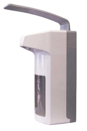 Manueller Spender für Desinfektionsmittel, Alcogel, Seifen und fließfähige Lotionen, für Wandmontage, geeignet für 500 ml Euroflaschen (nicht enthalten), Kunststoff-Gehäuse weiß, Edelstahl-Bedienhebel, mit DHP-Einwegpumpe, Dosiermenge 1,5 ml/Hub, mit weißer Abtropfschale